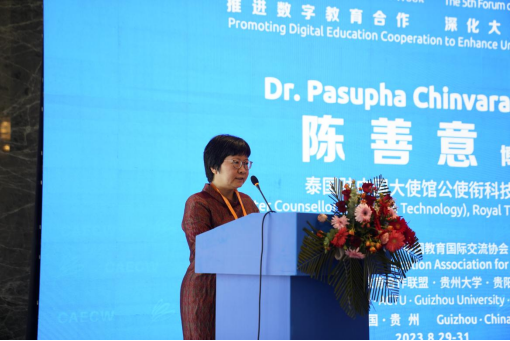 作为论坛的重要组成部分,在中泰大学校长论坛上,蔡英凤、蓬猜·蒙空瓦尼、张建华、宋塔温、潘查妮·高娜、贵州师范学院副校长任洁等积极探索智慧教育新模式,围绕“推进数字教育合作,深化大学互联互通”主题进行了深入交流,进一步深刻认识教育数字化的重要战略意义,拓宽中泰两国教育交流合作渠道,以期更好地服务两国高等教育合作需求、推进国际高等教育合作的理念与实践创新。报告中,蔡英凤围绕数字教育国际合作交流面临的新形势、数字教育赋能教育国际化的开云(中国)实践以及深化数字教育国际合作的构想与建议,介绍了我校在数字教育赋能国际合作与交流高质量发展方面的经验与实践。