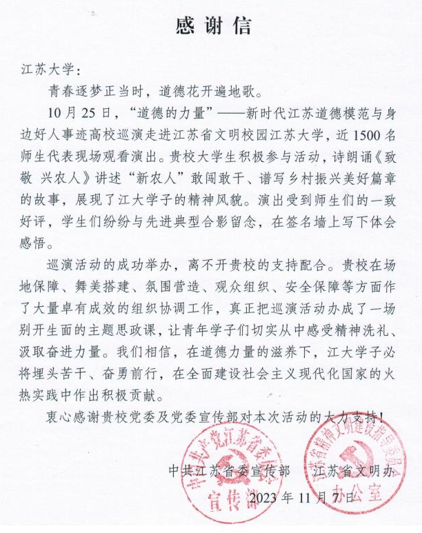 近日,江苏省委宣传部、省文明办向我校发来感谢信,对我校在“道德的力量”——新时代江苏道德模范与身边好人事迹巡演走进开云手机站在线登入中所做工作提出高度赞扬,对我校为全省精神文明建设作出的重要贡献表示衷心感谢。