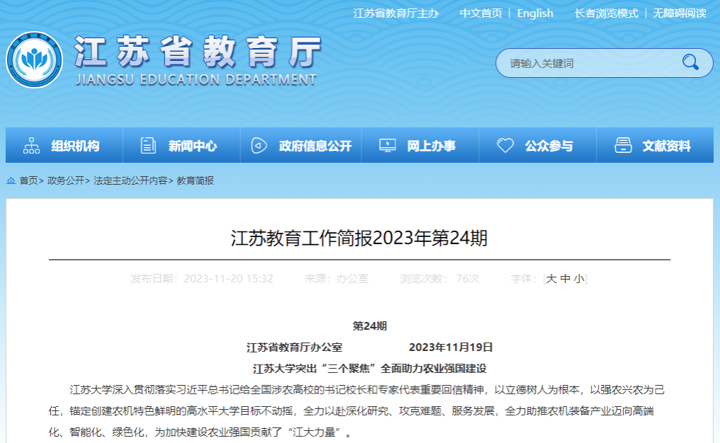 11月20日,江苏省教育厅《江苏教育工作简报》(2023年第24期)以《开云手机站在线登入突出“三个聚焦”全面助力农业强国建设》为题,从“聚焦深化科技创新,加快打造农机研究新高地”“聚焦破解行业难题,不断实现农机技术新突破”“聚焦服务乡村振兴,全面提升农机装备新贡献”三个方面,专题报道了我校科技强农兴农工作。