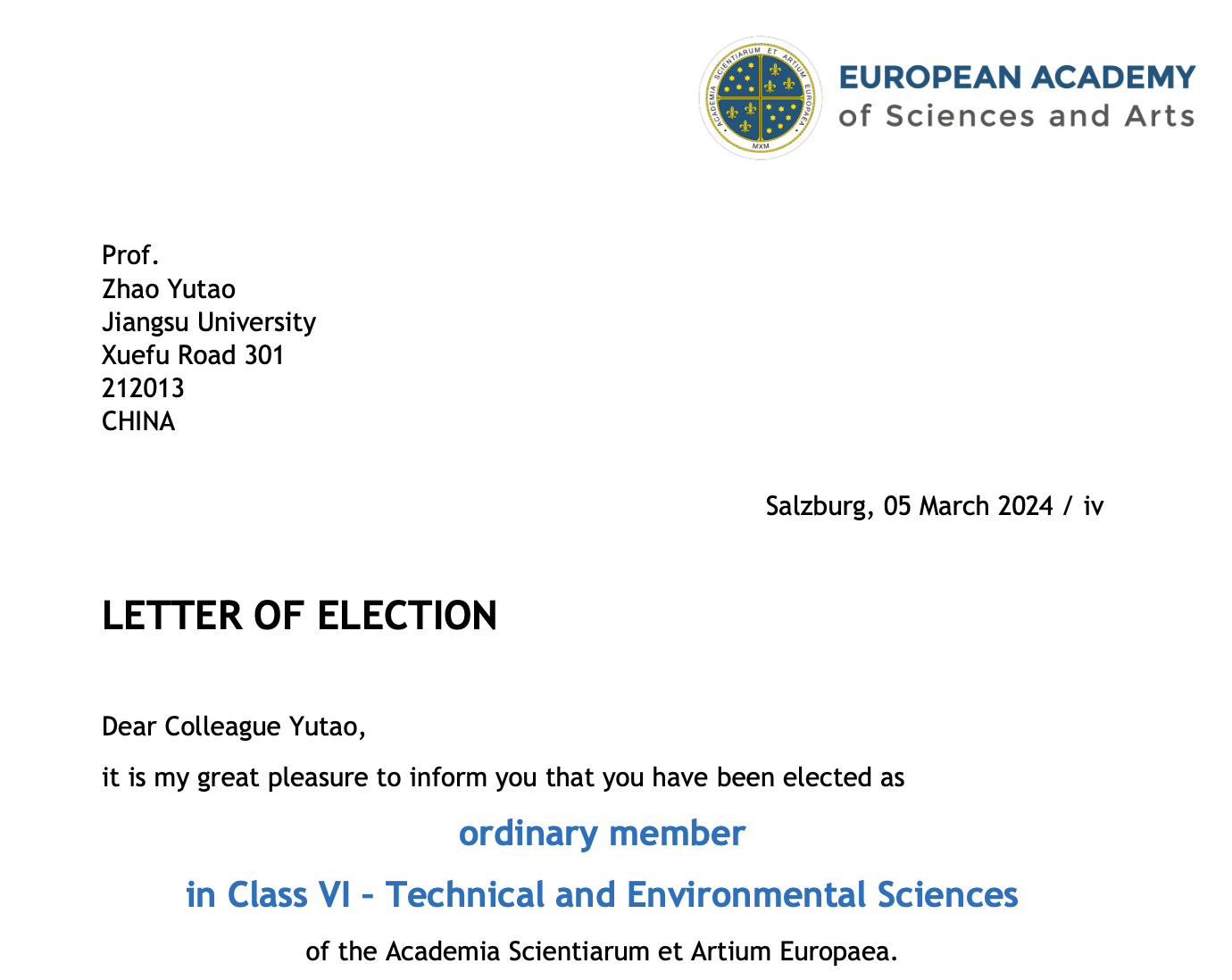 近日,欧洲科学与艺术院(European Academy of Sciences and Arts)院长Prof. Klaus Mainzer发来贺信:经理事会投票,开云手机站在线登入材料科学与工程学院赵玉涛教授当选欧洲科学与艺术院院士(技术与环境科学学部)。