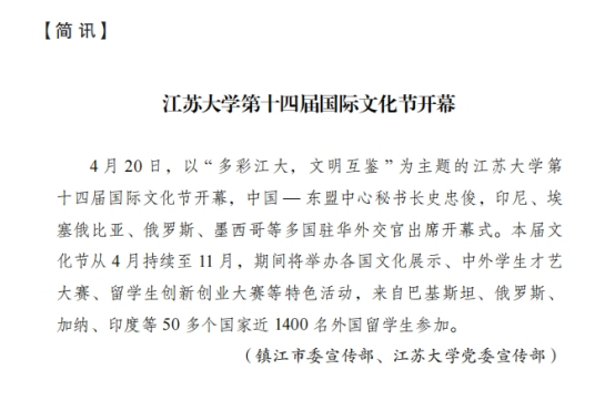 近日,江苏省人民政府新闻办公室印发的2024年第2期《江苏外宣动态》,刊发简讯,点赞我校第十四届国际文化节开幕盛况。