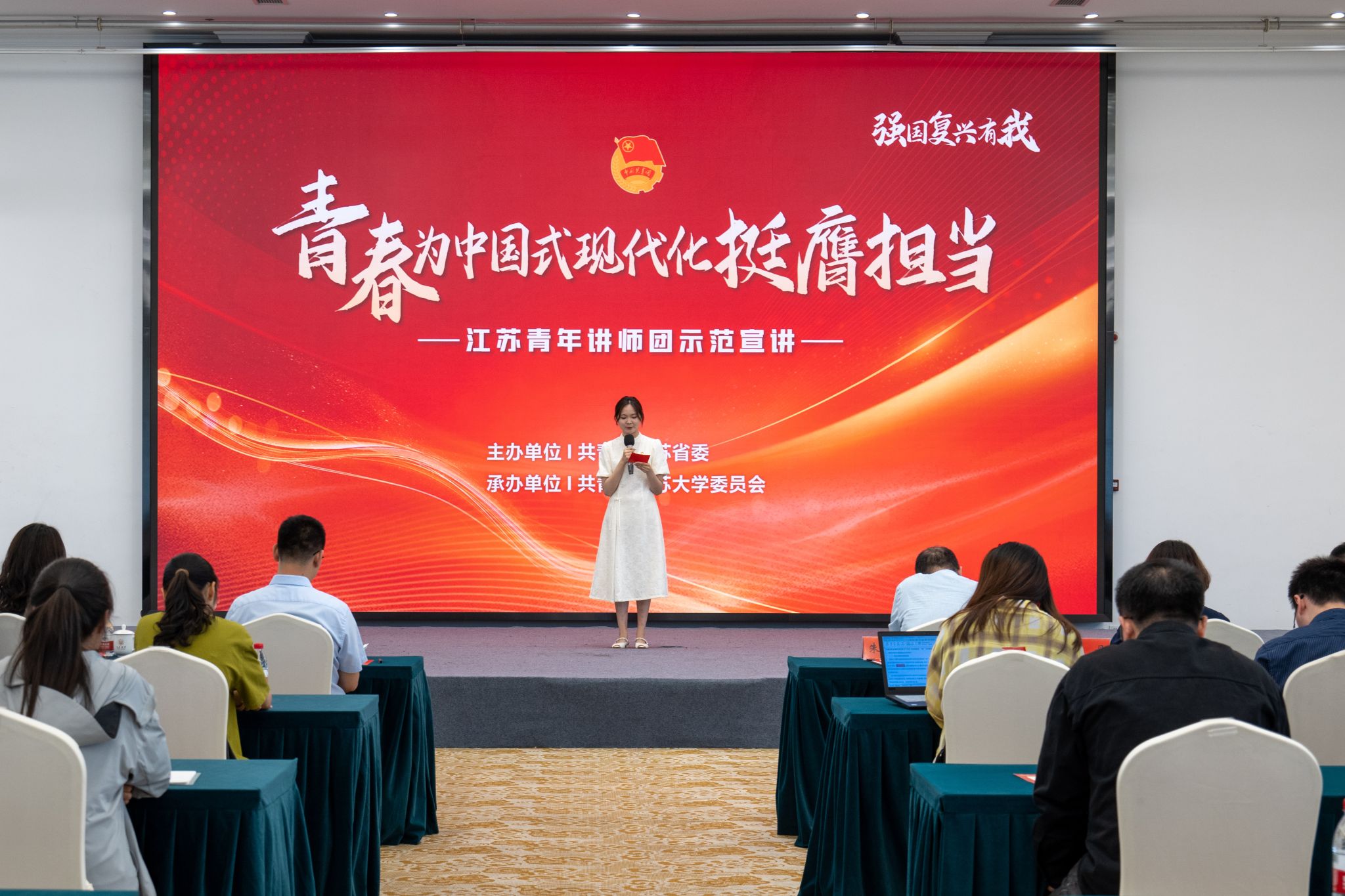 5月31日,强国复兴有我——“青春为中国式现代化挺膺担当”江苏青年讲师团示范宣讲活动在学校举办。团省委宣传部相关同志,团省委青年讲师团成员代表,校院两级团组织工作人员、学校青年讲师团成员代表及学生组织青年骨干近200人参加活动。