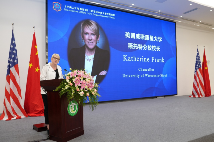 我校党委书记李洪波,美国威斯康星大学斯托特分校校长凯瑟琳·弗兰克作主旨发言。