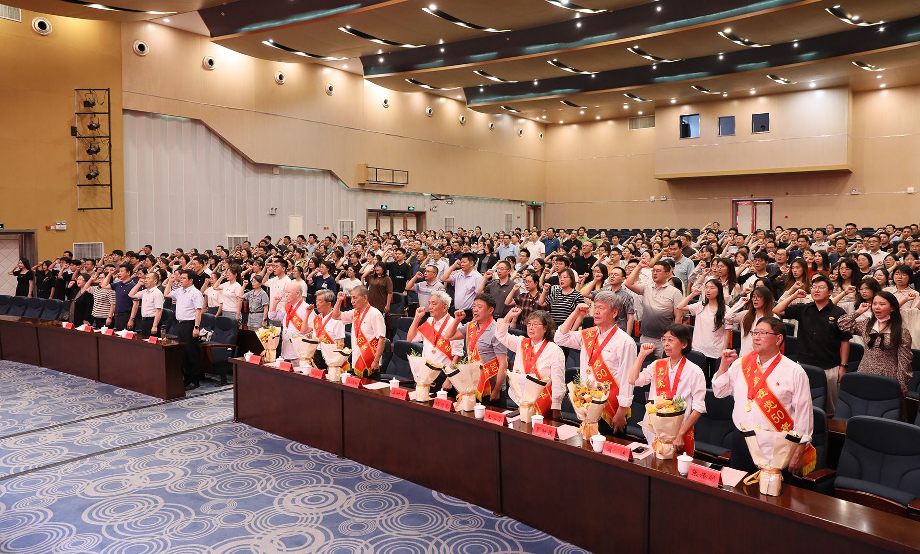 “光荣在党50年”党员代表,管理学院党委、财经学院党委、附属医院党委、机关党委教职工党员代表,新党员代表等400余人参加活动。(党委组织部)