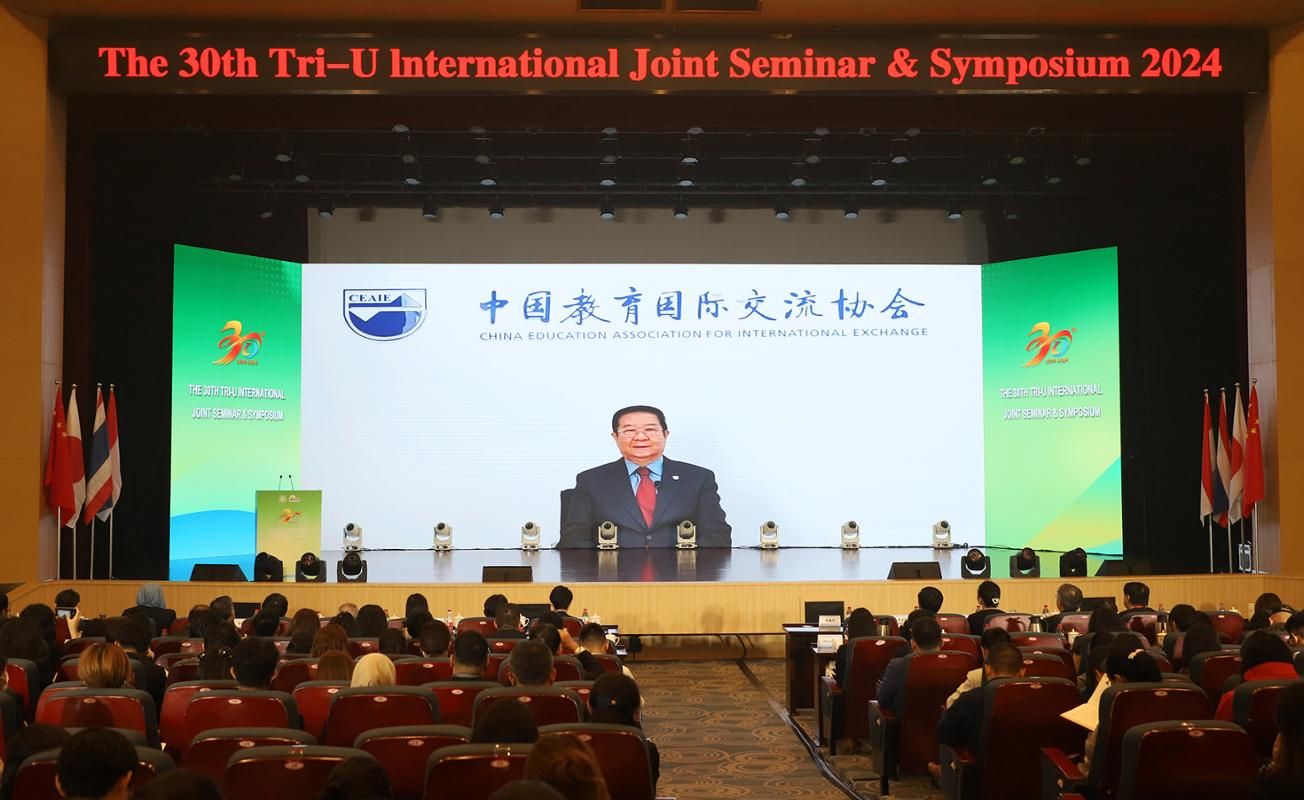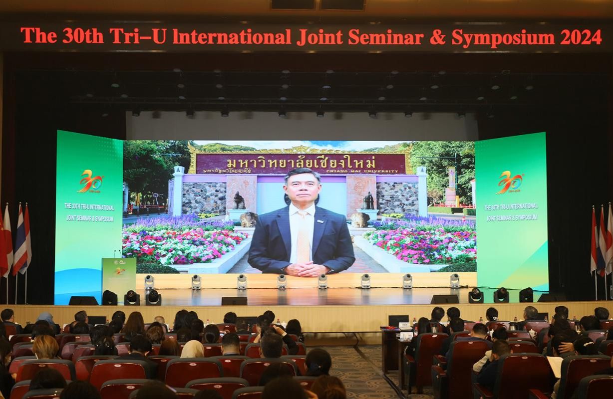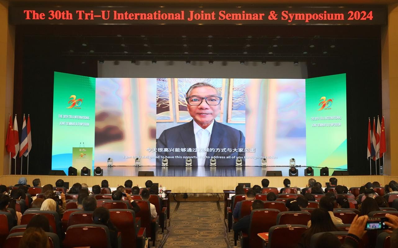 刘利民在视频致辞中表示,三十年间,“三国三校”国际学术研讨会始终秉持开放包容、合作共赢精神,一路携手并进,走出了一条具有区域特色的教育国际化品牌之路,始终紧跟全球发展脉动,推动跨国学术交流,汇聚了各国的智慧。研讨会交流成果不仅为应对全球挑战提供了理论和实践支持,也为亚太地区高等教育合作注入了活力,助力亚太地区具有国际视野和责任感的青年相互促进、成长成才。他希望“三国三校”国际学术研讨会持续坚守合作共赢的初心、持续架设多国多校间交流的桥梁、持续深入研究和解决人类面临的共同挑战,为构建人类命运共同体贡献更多的智慧和力量。