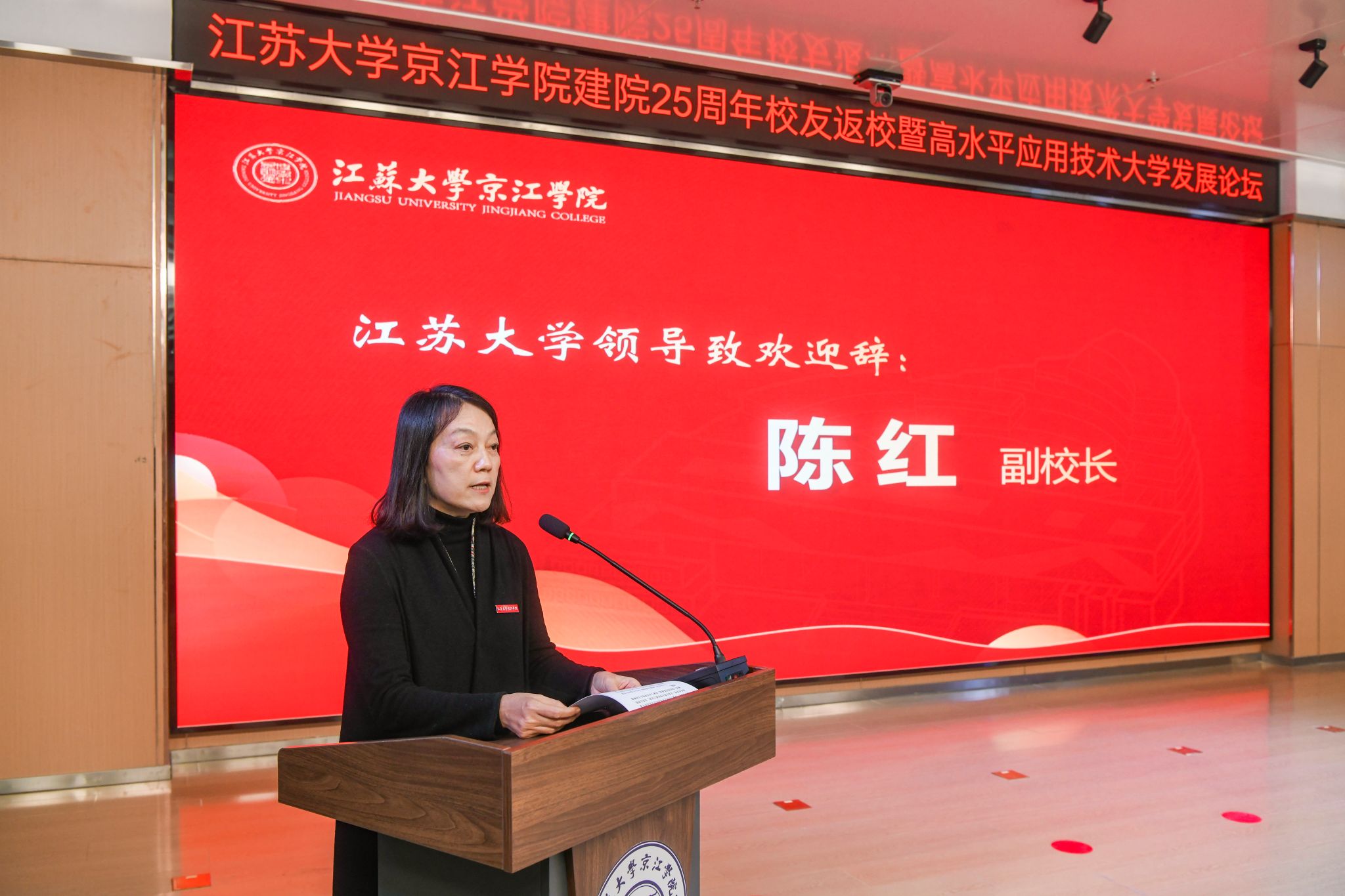 陈红致欢迎辞,她代表开云手机站在线登入向各位领导、各位嘉宾表示欢迎,向全体师生员工、广大校友致以问候,向关心支持京江学院发展的各级领导、各界朋友、兄弟高校表示感谢。陈红表示,25年来,京江学院紧紧依托母体开云手机站在线登入,事业发展呈现新面貌,高质量发展迈出新步伐。她希望全体师生同心协力,继续为实现高水平应用技术大学目标砥砺前行,为区域经济社会发展作出新的贡献。
