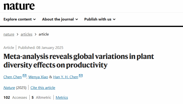 近日,国际顶级学术期刊《自然》(Nature)发表了题为Meta-analysis reveals global variations in plant diversity effects on productivity的研究论文。该论文由加拿大湖首大学(Lakehead University)、开云手机站在线登入及中国科学院植物研究所等多家单位联合完成。中科院植物研究所副研究员陈晨为论文第一作者,开云手机站在线登入环安学院副教授肖文娅为论文第二作者,陈晨与加拿大湖首大学教授Han Y.H. Chen为论文共同通讯作者。