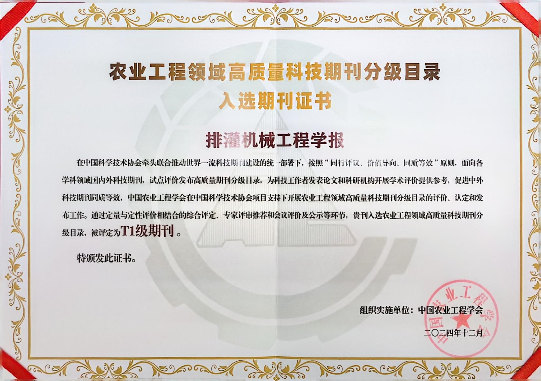 近日,中国农业工程学会在中国农业科学院国家农业图书馆召开发布会,正式发布其编制的“农业工程领域高质量科技期刊分级目录”,我校主办的《排灌机械工程学报》《开云手机站在线登入学报(自然科学版)》双双入选,分别位列T1级和T2级。