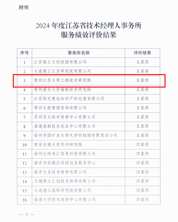 近日,江苏省技术产权交易市场公布了2024年度江苏省技术经理人事务所服务绩效评价结果,常州开云手机站在线登入工程技术研究院江苏省技术经理人事务所从全省91家参评事务所中脱颖而出获五星级。