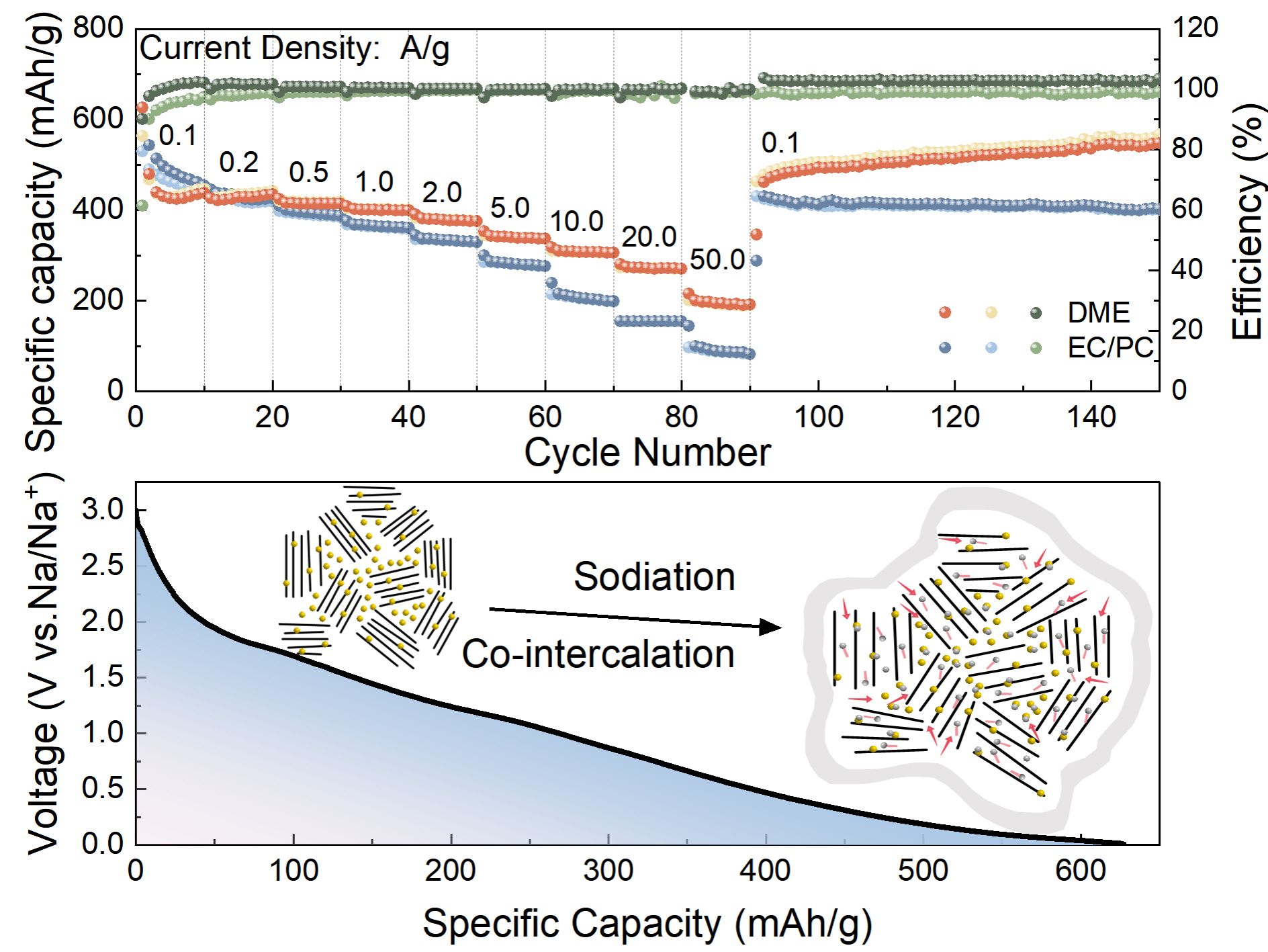该论文报道了一种高性能硫掺杂碳纳米片(SDCNs)负极材料用于钠离子电池。研究创新性地发现,醚基电解液(DME)对SDCNs的性能至关重要。与酯基电解液相比,在DME中,SDCNs展现出显著提升的倍率性能,在50A/g超高电流密度下仍能提供191mAh/g的比容量。同时,其在0.1A/g下循环300周后比容量提升至617mAh/g,表现出优异的循环稳定性和自优化能力。机制研究表明,醚基电解液促进了溶剂化钠离子的共嵌入,扩大了碳层间距,形成了超薄固态电解质界面膜,从而极大提升了体相和界面的离子扩散与存储动力学,有效激活了内部的碳纳米空隙和硫掺杂位点。该工作为高性能钠离子电池碳负极材料及电解液的设计提供了新思路。