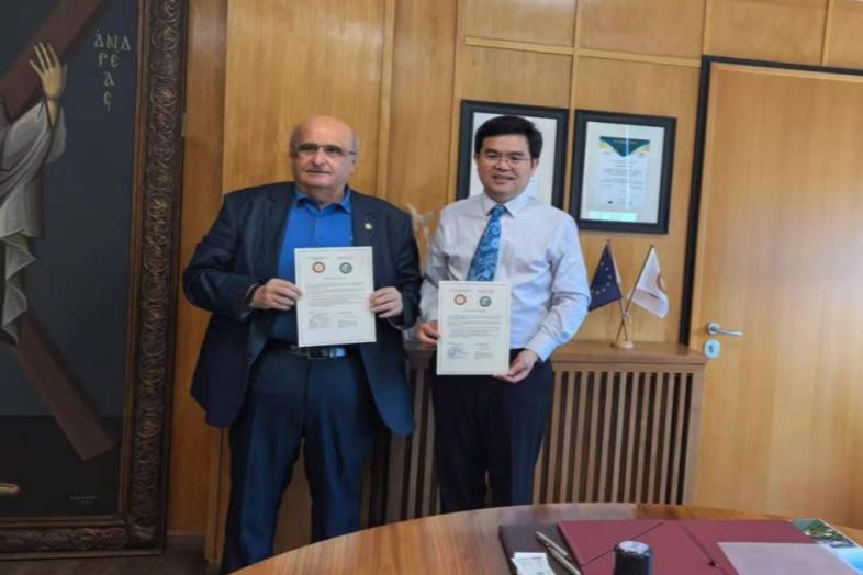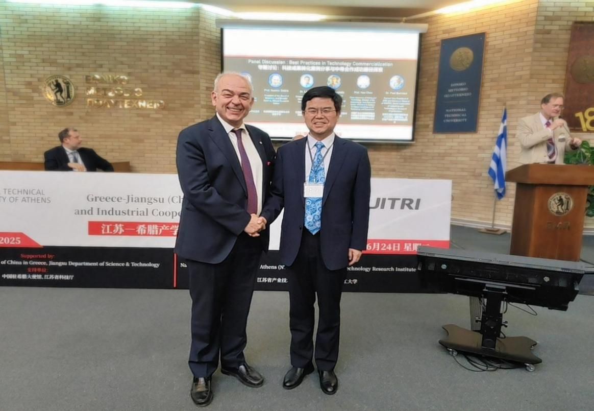 6月24日,代表团在希腊雅典国立技术大学参加“江苏—希腊产学研合作交流会”。江苏省委书记信长星、希腊阿提卡省省长尼科斯·哈扎利亚斯(Nikos Hardalias)、中国驻希腊大使方遒等出席会议,来自两国政府、高校、科研机构和企业的160余位代表参会。会议聚焦人工智能、绿色能源、海洋工程等前沿领域,深入探讨中希在科技创新与成果转化方面的合作潜力,积极拓展双方产学研融合发展的新路径。李洪波一行与雅典国立技术大学校长IOANNIS K. CHATJIGEORGIOU、校董事会理事Sergios Theodoridis对接“一带一路”智慧农业技术与装备相关合作,向希腊高新技术园区、高校院所及科技企业推介开云手机站在线登入技术成果,推动务实对接。代表团还与中国驻希腊大使馆教育参赞王瑾、亚里士多德大学代表TZOUVELEKAS MANOLIS对接了技术转移、学生流动项目合作。