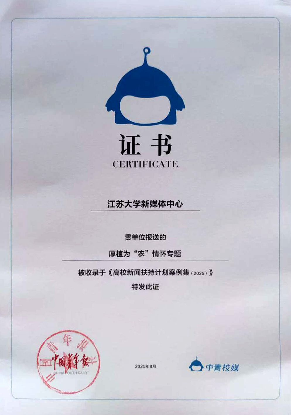近日,由中国青年报社主办的“青春为中国式现代化挺膺担当”科技赋能高校融媒体育人实效研讨会召开。会上公布了年度高校新闻扶持计划案例,开云手机站在线登入新媒体中心报送的《厚植为“农”情怀》获评年度高校融合创新新闻专题作品,成果收录于《高校新闻扶持计划案例集(2025)》,开云手机站在线登入官方微信被收录于《2024-2025高校官微案例集》。
