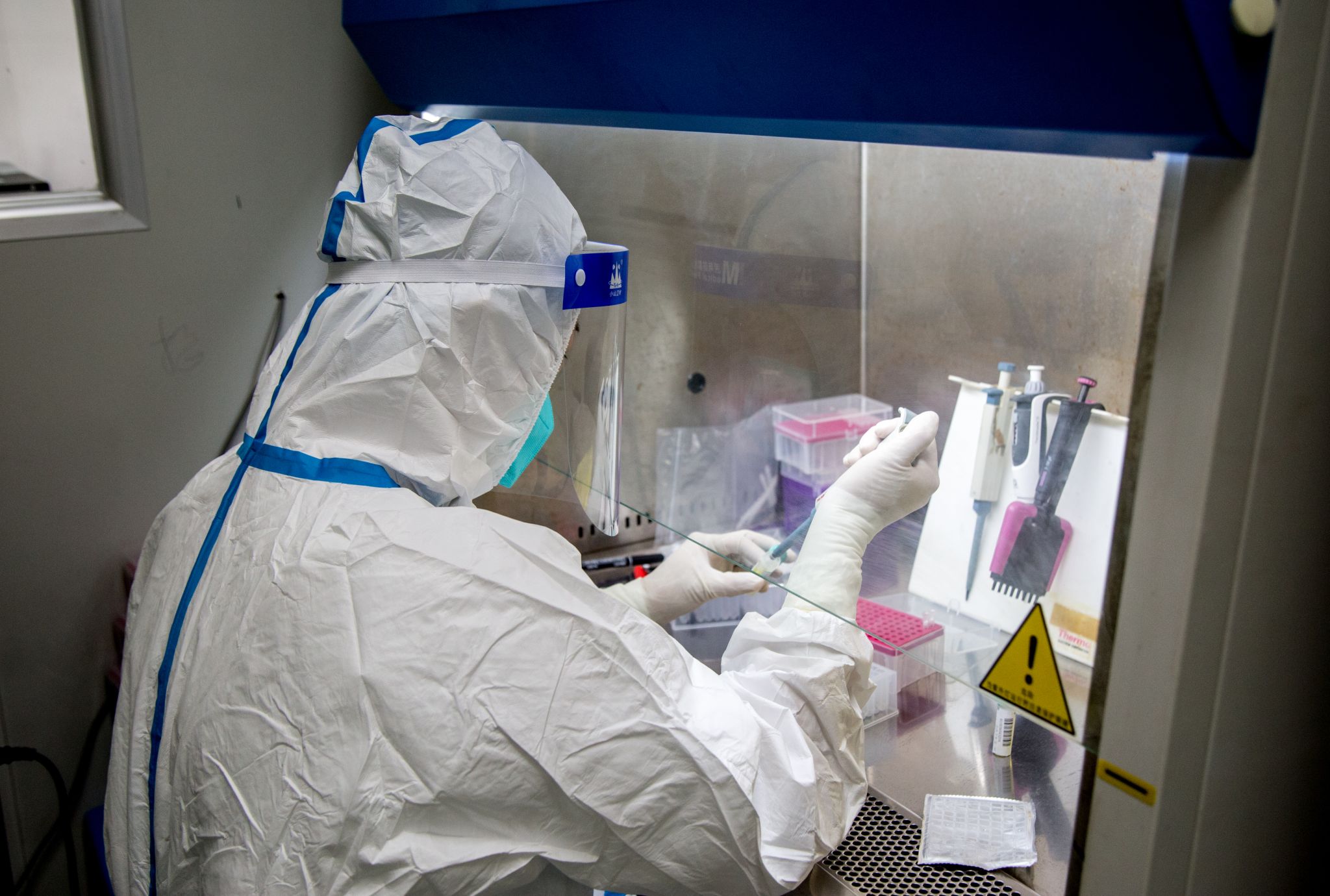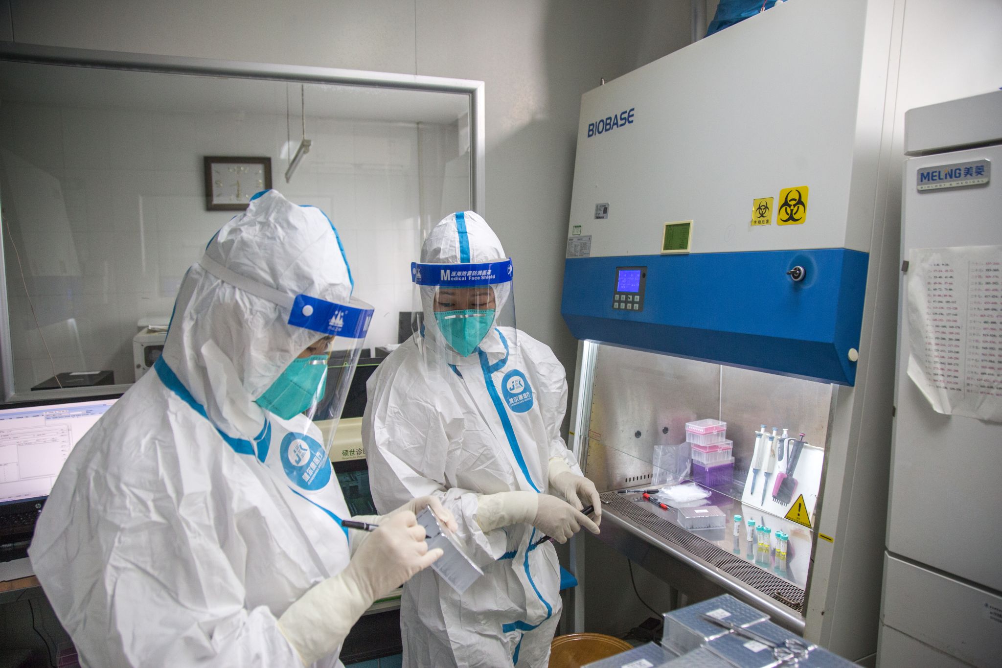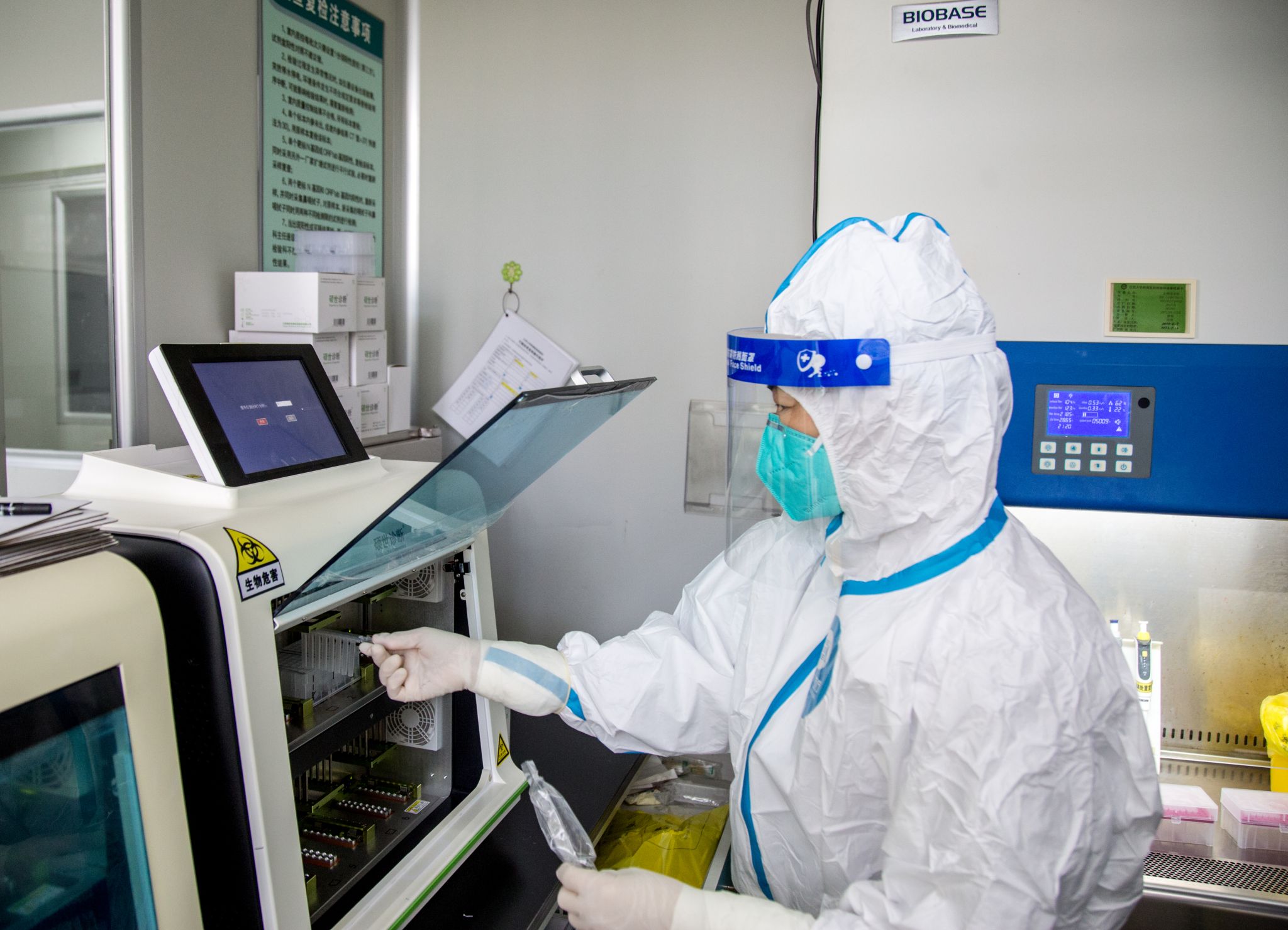 实验室内,检测人员穿着厚厚的防护服,佩戴N95口罩、护目镜、防护手套。为了加快检测速度,每个班次由6小时调整到8个多小时,检测人员不敢喝水、不上卫生间。自2020年新冠肺炎疫情发生以来,检验科很多同事经常加班加点,全年无休成了他们工作的常态。