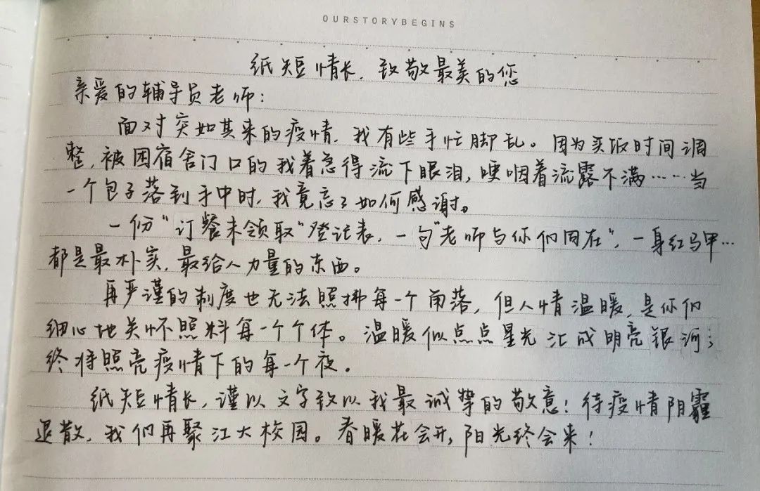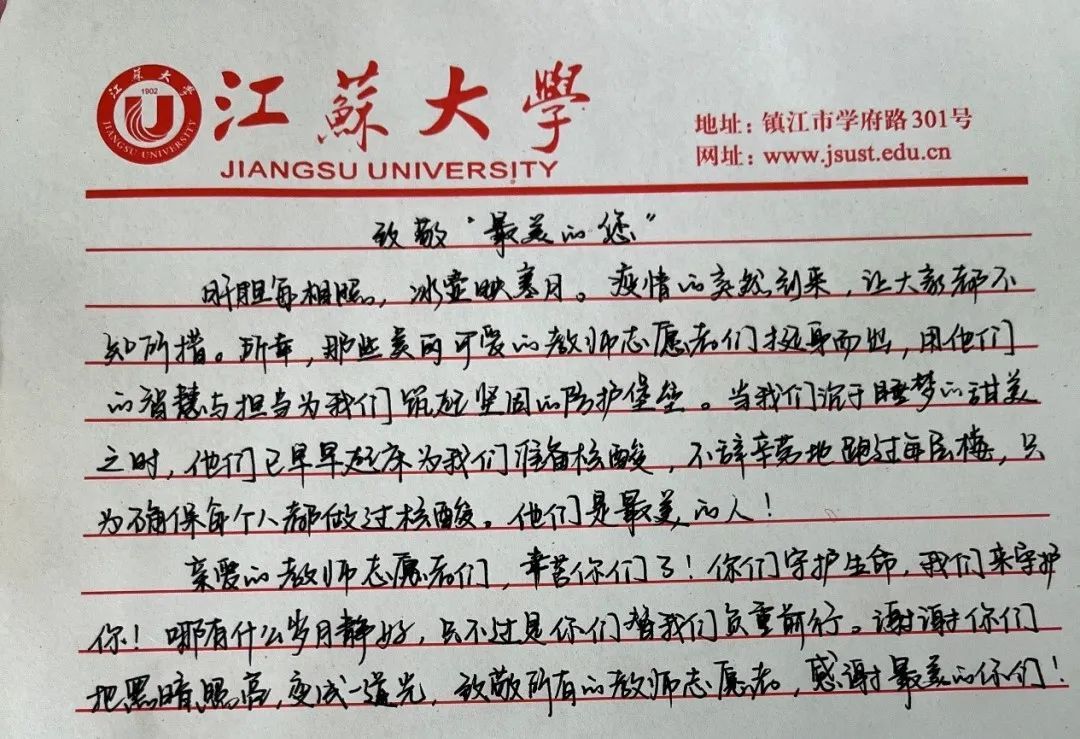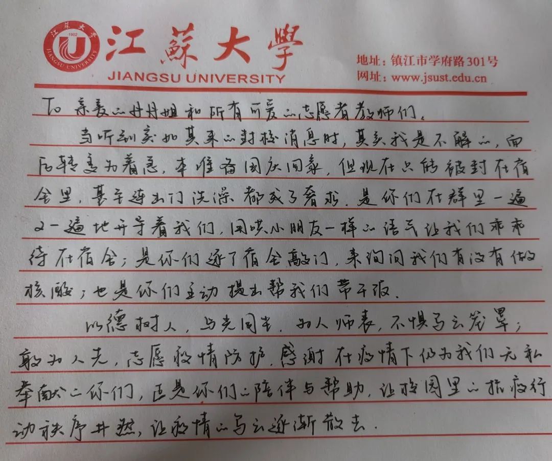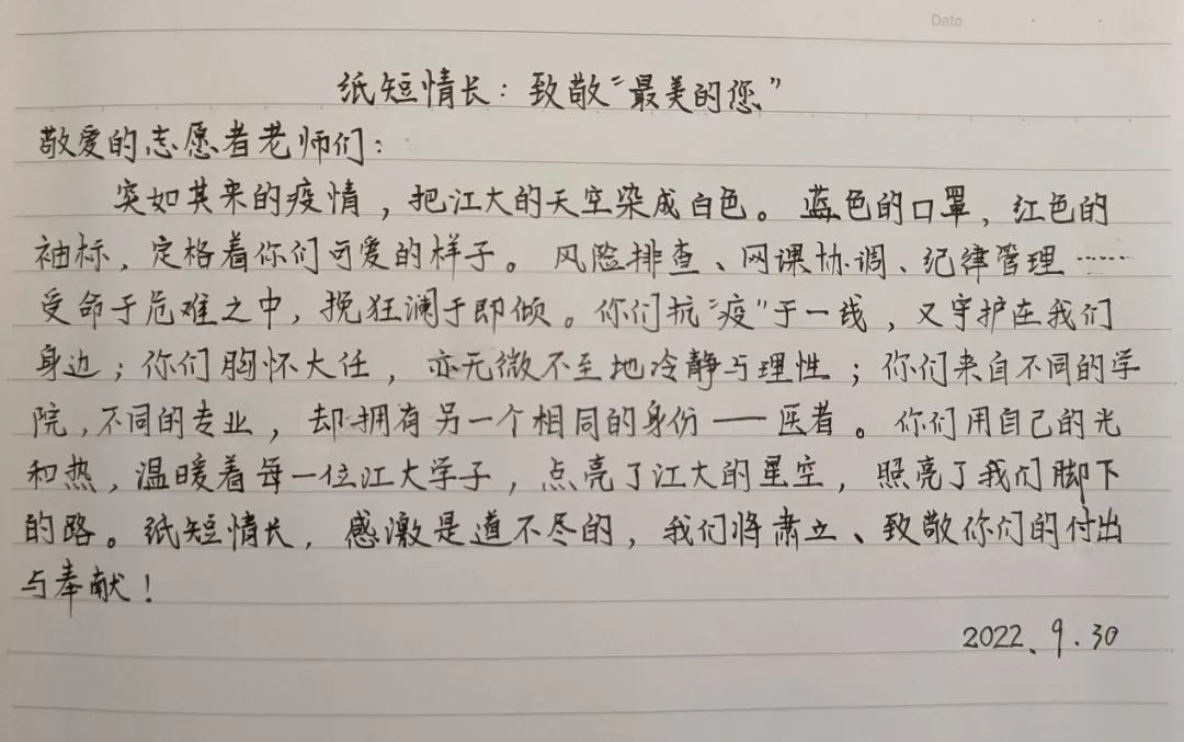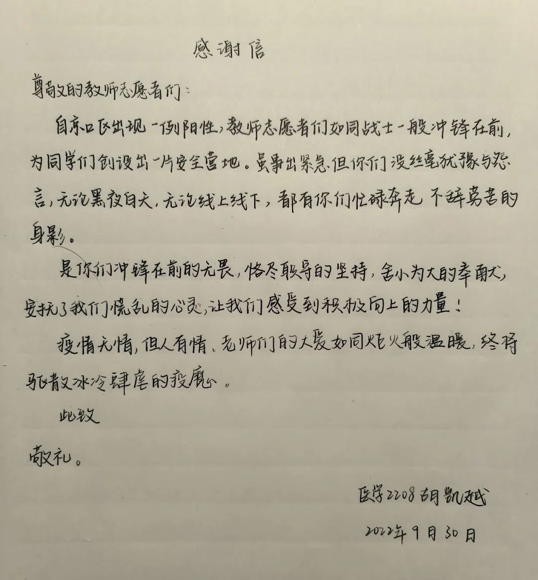 9月27日晚,疫情突袭,校园静默化管理,让青春洋溢的校园一夜沉寂。但温暖仍存,一个个志愿者为学生保驾护航。医学院的莘莘学子,怀揣感恩,为志愿者写下封封书信,纸短情长,愿温暖你我。