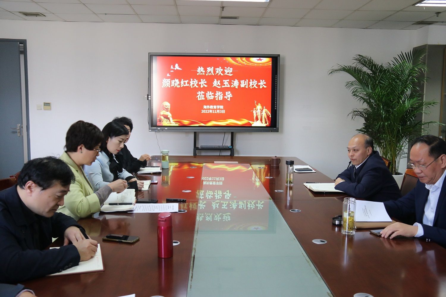 11月3日,校长颜晓红、副校长赵玉涛一行调研指导海外教育学院。校长办公室、国际合作与交流处负责人陪同调研,海外教育学院全体中层干部、部分科级干部参加座谈。