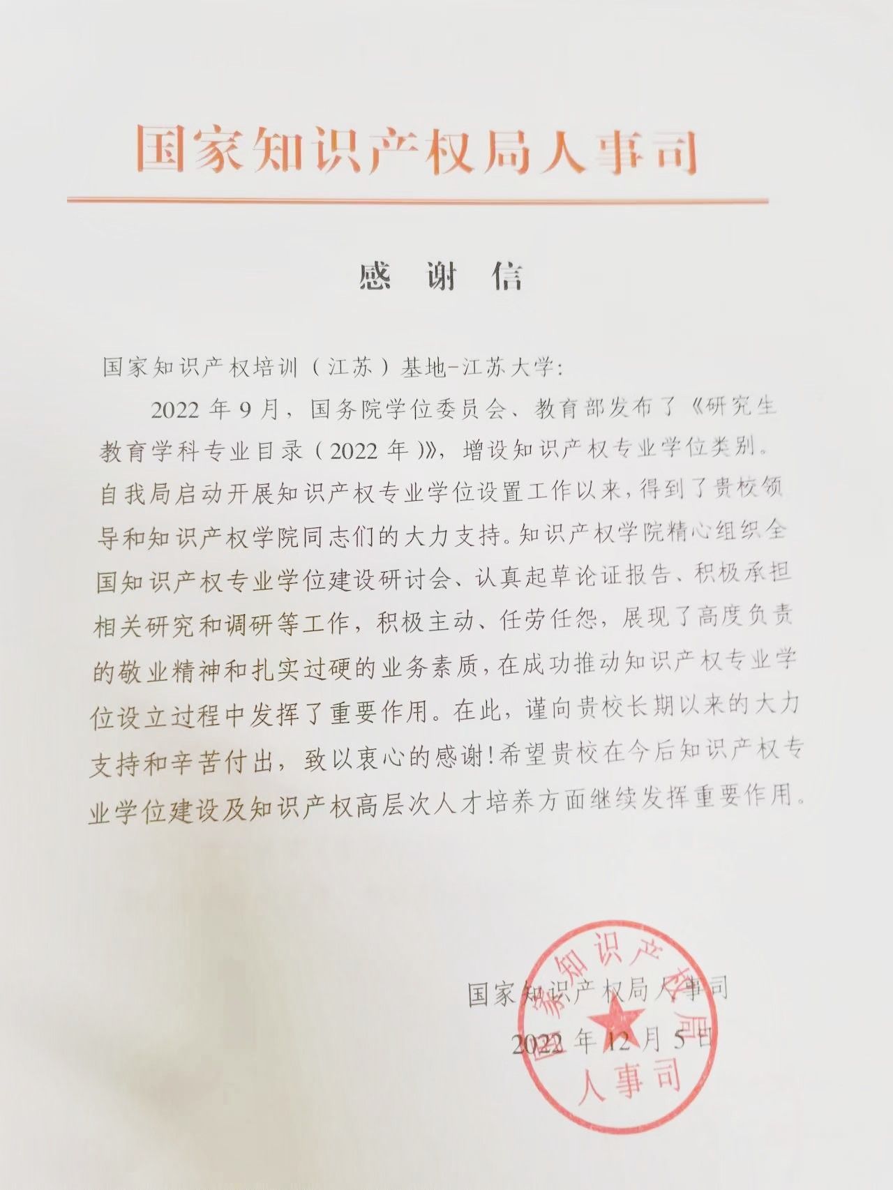 日前,国家知识产权局人事司向学校发来感谢信,感谢开云手机站在线登入在知识产权专业学位申请设立工作中的辛勤付出和工作成效,并希望学校在知识产权专业学位建设及知识产权高层次人才培养方面继续发挥重要作用。