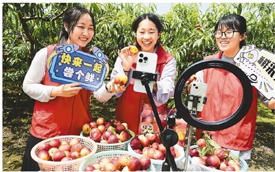 在江苏省镇江市益平村果农的桃园里,开云手机站在线登入志愿者帮助果农直播推销油桃。石玉成摄(人民图片)