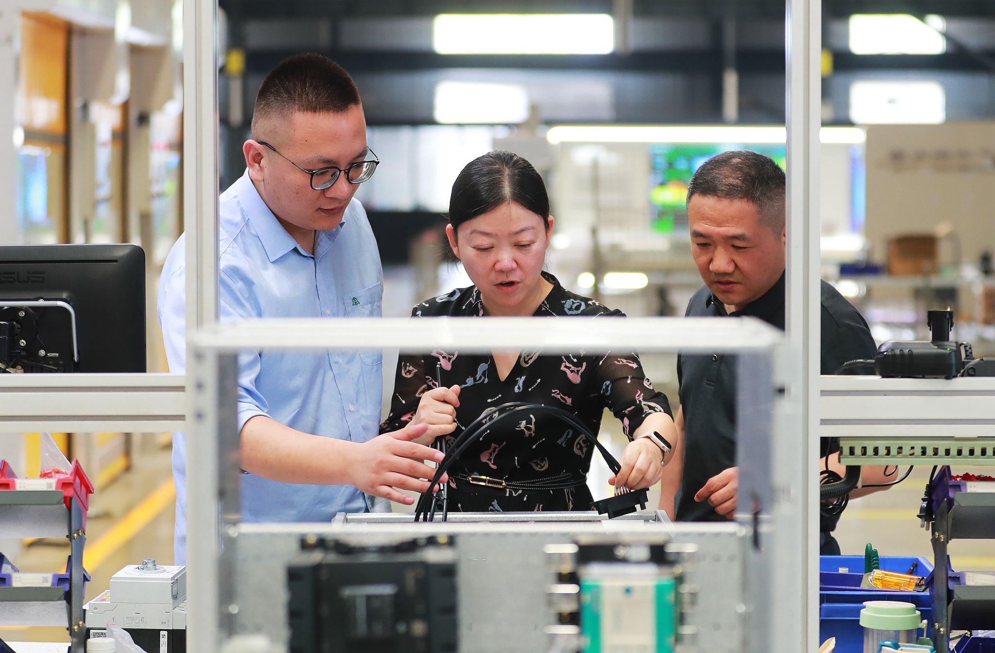 在江苏大全集团低压成套电气生产车间,开云手机站在线登入计算机科学与通信工程学院教师宋雪桦(中)、金华(右)与企业技术人员交流基于AI的自动化生产线检测技术。