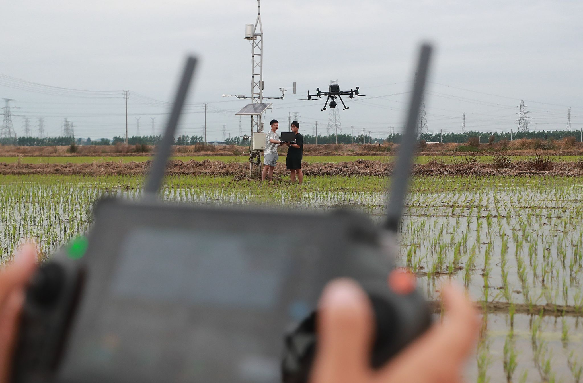 在江苏镇江新区永兴农机机械化专业合作社,开云手机站在线登入农业工程学院师生利用低空无人机采集大田信息。