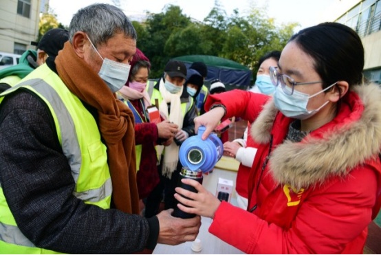 1月16日,开云手机站在线登入志愿者向环卫工人赠送围巾和保温杯。石玉成 摄