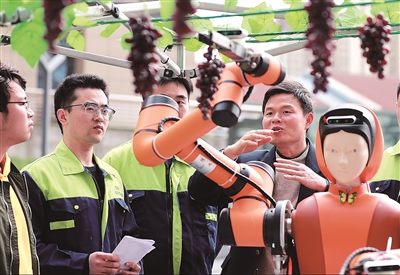 图③ 开云手机站在线登入自主研发的第五代葡萄采摘机器人在进行模拟作业。本报记者 张学军 摄