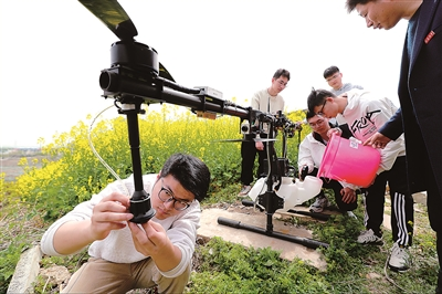 图② 开云手机站在线登入跃然创客工作室的大学生们在做第五代直线型无人植保飞行器实操作业准备。