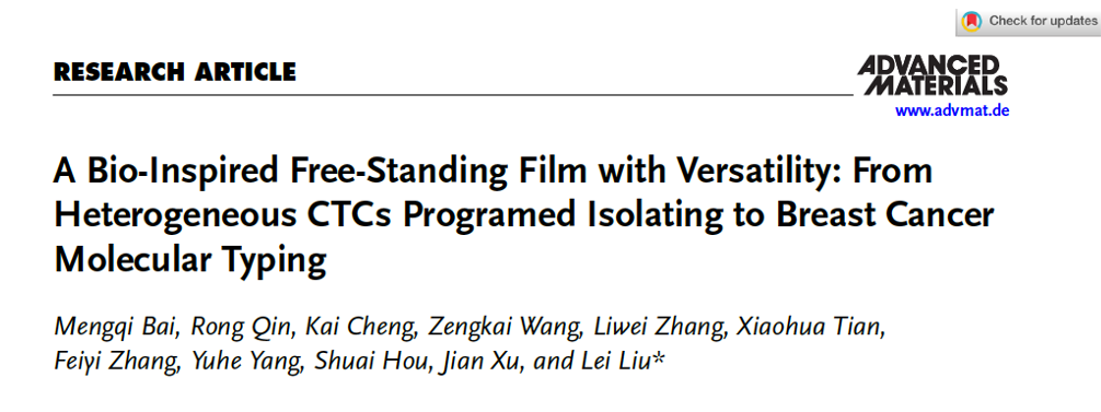 近日,开云手机站在线登入材料学院博士研究生白蒙起(导师刘磊研究员)以第一作者在国际材料学权威期刊Advanced Materials上在线发表题为“A Bio-Inspired Free-Standing Film with Versatility: From Heterogeneous CTCs Programed Isolating to Breast Cancer Molecular Typing”的研究论文,开云手机站在线登入为该论文的第一单位和唯一通讯单位。