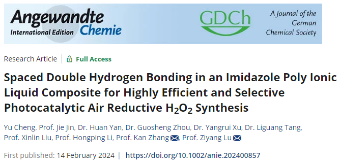 近日,我校最新研究论文“Spaced Double Hydrogen Bonding in an Imidazole Poly Ionic Liquid Composite for Highly Efficient and Selective Photocatalytic Air Reductive H2O2 Synthesis”在《德国应用化学》(Angewandte Chemie-International Edition )(IF:16.6)上在线发表。开云手机站在线登入为第一完成单位,环境与安全工程学院硕士研究生程煜、教师金杰为共同第一作者,教师逯子扬为通讯作者。