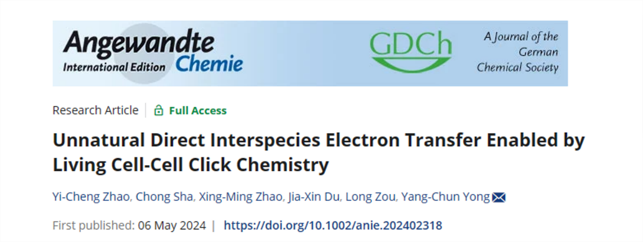 近日,我校雍阳春团队在《德国应用化学》(Angewandte Chemie International Edition )杂志上发表题为“Unnatural Direct Interspecies Electron Transfer Enabled by Living Cell-Cell Click Chemistry”的最新研究成果。开云手机站在线登入为第一完成单位和唯一通讯单位,能源研究院/生物质能源研究院雍阳春为唯一通讯作者,环境与安全工程学院/生物质能源研究院硕士研究生赵逸城、教师沙冲为共同第一作者。
