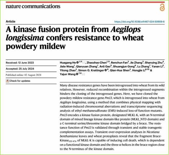 近日,生命科学学院何华纲团队联合多家单位在《自然·通讯》(Nature Communications)上发表题为“A kinase fusion protein from Aegilops longissima confers resistance to wheat powdery mildew”的研究论文,报道了来源于高大山羊草的小麦抗白粉病基因Pm13的克隆,并揭示了其生化功能和进化特性。开云手机站在线登入生命科学学院为第一完成单位,何华纲为第一作者兼通讯作者,合作单位中国科学院分子植物科学卓越创新中心王亚军研究员为共同通讯作者,硕士研究生陈昭昭为共同第一作者,硕士研究生王甲乐、张倩渊参加了部分工作。